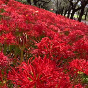 今日のお花、彼岸花。 先程の所から振り返った場所にもぎっしり咲いていました。 今日から雨のためか、桜のお花見の頃の様な人出でした。 綺麗です✨ 幸手市権現堂堤にて