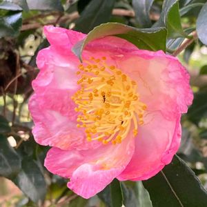 サザンカ(山茶花)がもう咲いていました😊 ピンクのグラデーションが綺麗です❣️ お客様もいました🐜