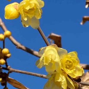 久し振りに幸手市権現堂にお散歩に🚶♀️ もう蝋梅(ロウバイ)が咲いていました🎶 今年は早いのではないでしょうか。 とっても良い香りです✨ 花びらが蝋細工の様です。 冬の澄んだ青空に映えますね😊