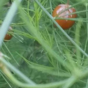雌雄異株 (野菜) 直径5~8mmほど 緋紅色の球形の果実 この中には黒いタネが 数個入っています🎶 果実は柔らかく簡単に つぶれました。 果肉は意外に甘くて美味しい😋 アスパラガス果実 キジカクシ科
