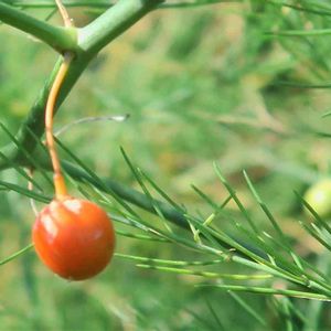 アスパラガス 野菜でなく観賞用のアスパラガス 狭く日陰の劣悪な環境の中 5月に1cmにも満たない 小さな小さな白花が咲き 実が付き 緑から赤に衣更え 少々時間がかかりそう、、、