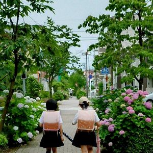 紫陽花ロード🌿 朝降っていた雨が止みました🌥 鮮やかさを増した紫陽花の道を子供達が下校して行きます