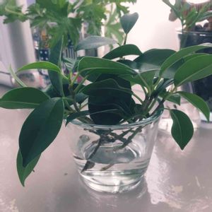 フィカスナナです。 葉っぱが小さくて可愛いですよ。 まんまるのシルエットに一目惚れして購入しました。 小柄なのでどこにでも置けます。