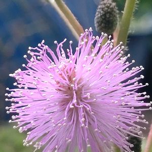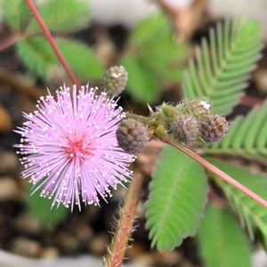 鉢植えのオジギソウしか見てなかったので 砂利道に咲いていたので触ってみたら 棘があり痛かったです。ピンク色のボウルのような形をしてます。