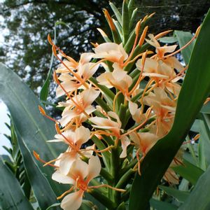 ニクイロシュクシャ (ジンジャーリリー) 時々見かけていた背の高いこの花はジンジャーリリーで、このオレンジ色のはニクイロシュクシャと言うらしいです。確かに肉色! 花弁や蕊も面白そうでした。