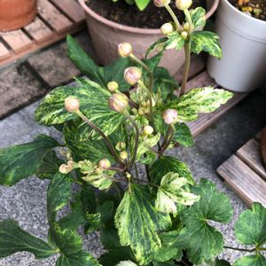 🍀斑入り秋明菊 初音 先日の秋明菊 セピアと一緒にお迎えしました💕 この子もネットでチェックしていた子でした。 お迎えした時の蕾が咲いていました。 今年のお花はこの子で終わりかなぁ💧 来年、たくさんのお花が見られるように大切にお世話しなきゃね💕
