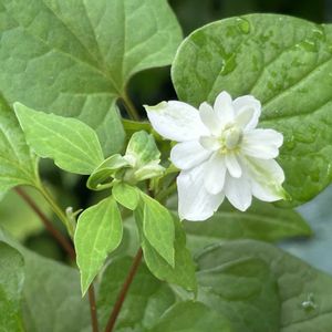 我が家でも、八重咲きのドクダミが咲き出しました。名前から受ける印象とは異なり、清楚で可愛い花ですね。 白に薄っすら緑色が混じる花びら(苞)も素敵です。庭には一重のドクダミがあちこち顔を出すので、この花は鉢植えです。
