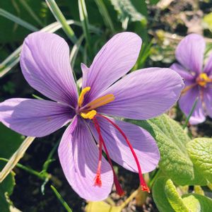 朝の濃霧から秋晴れのお庭に☀️ 足元でサフラン💜が咲いています 春にお引越しをした場所を すっかり忘れてました ここだったのね😅 薄紫色が綺麗゚・*:.。. .。.:*・゜ 赤い雌しべも魅力的よ また元気に咲いてくれて ありがとぅ~ヾ(〃^∇︎^)ノ♪︎