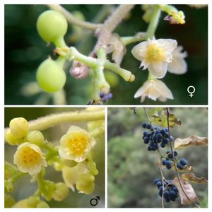 アオツヅラフジ ツヅラフジ科 つる性落葉木本 蔓は右巻き 実になると気づくのですが、今年は花も見る事ができました 一瞬オニトコロ?と、思いましたがしっかりした可愛いお花 初めて見たのは↑雌花 調べて見ると雌雄異株 早速雄花を探しに行くと雌花の近くの木に↙︎雄花が咲いてました 雄花は6本の雄しべ、雌花につく雌しべの柱頭は6個ある 果実は核果(梅と同じ)6〜8mm 有毒 2022.11.5撮影