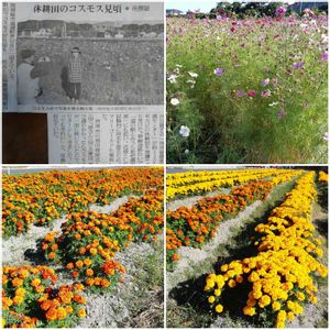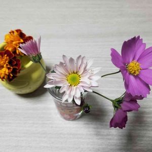 おはようございます。 今朝咲いている花を、集めました。 キキョウ。 マリーゴールド。 コスモス。 ペチュニア花衣藍染。 白いマーガレット。