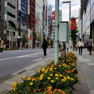 銀座の歩行者天国。 会社の先輩が出展した展示会に行って来ました。マリーゴールドさんたちが、少し寂しい銀座六丁目辺りを賑わわせていました。💛❤️💜