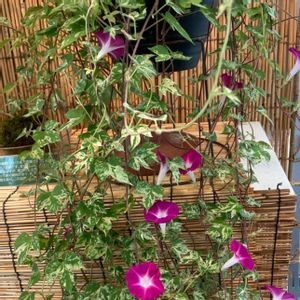 フラワーパーク江南で開催の変化朝顔ミニ展 数鉢でしたが初めての出会い😍 ①枝垂れ朝顔紅ちどり ②蜻蛉葉の朝顔 ③葉っぱが蜻蛉の羽の形 ④龍葉の朝顔 ⑤左が龍葉、右が柳葉 こちらのお花が見たかった😂