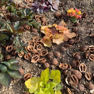ヒューケラも寄せ植えから出してきました。 奥側にあるのは、12月末に寄せ植えから出して地植えしたのですが、どんどん大きくなりました……! でもこれ、ブラックジェイドで合ってる……? 購入履歴にはブラックジェイドって書いてるけど、ほかの写真みても色合いが違うような。 暑い時期からずっと紫系の色な気がする💦