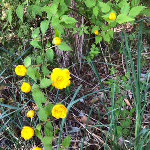 我が家の裏庭の八重山吹、満開です🧡 黄金色の山吹に目がくらんではいられません‼️ 草や笹竹におおわれそうです💚 挿木で増えて、あちこち咲いています‼️