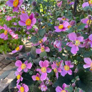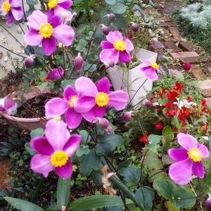 春に植えた秋明菊。八重咲きの方はコスモス畑のような感じで咲いてます🌺😅 隣で一重は影になり少数ですが、こちらは可愛いです。 実は…、一重の紅白で買ったつもりだったんですけどね…💧(*´ω`*) 来年、白花株を増やします📝🌱