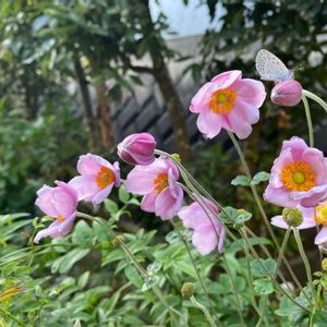 ピンク秋明菊 咲きすすんで〜🌸 はごろもジャスミンのトレリスに支えられてる後ろのこの子は 倒れずに開花してますが… 他の株は背が高くてヒョロヒョロなので あっちこっちに倒れて咲いてます😅 🤭ちっちゃい蝶が🦋 大きな蝶は逃げて行くけど…じっと止まったまま〜分かりますか〜 名前なんだっけかな⁇