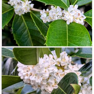 キンモクセイにちょっと 遅れて咲き始めます🎶 雌雄異株 雄株のみが知られていて 結実はしません😹 かすかに芳香がある花✳️ ヒイラギとギンモクセイの 交雑種。 柊木犀(ひいらぎもくせい) モクセイ科
