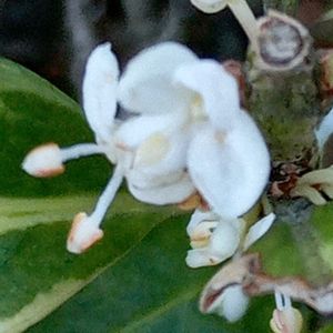 キンモクセイにちょっと 遅れて咲き始めます🎶 雌雄異株 雄株のみが知られていて 結実はしません😹 かすかに芳香がある花✳️ ヒイラギとギンモクセイの 交雑種。 柊木犀(ひいらぎもくせい) モクセイ科