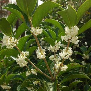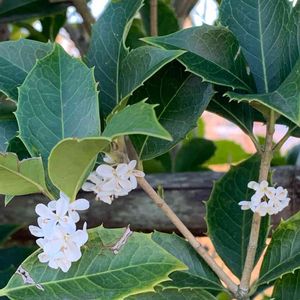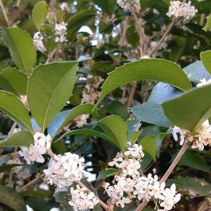 真っ白なこの花はヒイラギモクセイ(柊木犀)です。珍しい木ですね。 金木犀や銀木犀より少し遅れて今の 時期に開花します。 柊と銀木犀の雑種と言われていて、葉は柊に花は銀木犀に似ておりいい香りが漂います。 中国原産。 モクセイ科モクセイ属の常緑小低木。
