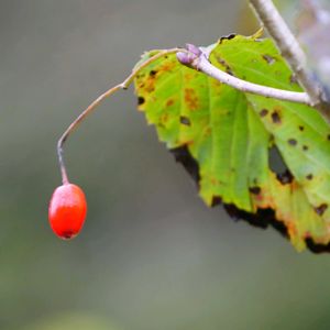 11/13 山歩き⛰️ もう一つ、赤い実を😍 オトコヨウゾメ、普通複数の実を散房状につけるのですが、たった一個だけ残っていました、鳥さん🐦⬛に食べられたのかなぁ⁉️ 葉はご覧のような対生ですが、頂小葉がありません。