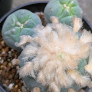 ロフォフォラ 翠冠玉 ちょっと徒長させてしまった感はあるのですが、落雷したのかと思うほど毛が爆発しています🤣 3枚目が1年ちょい前のお姿ですが… 同じコとは思えない毛量になりました😳