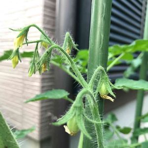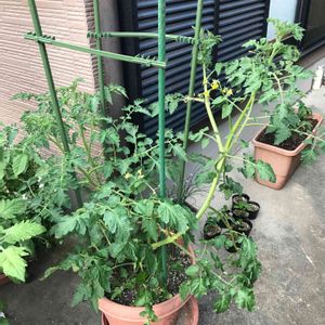 そろそろ支柱のてっぺんまで到達しそうです。 樹勢は他のミニトマトの方が強い。