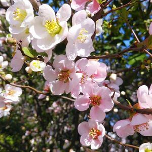 不思議(*˘︶˘*).。*♡ 同じ枝に白とピンクの可愛い花が❤ 今日のお花🌼 和名:ボケ「木瓜」🌸 3月アルバムより🎵 花言葉✿❀ 『先駆者』『指導者』『平凡』から 『魅惑的な恋💕』色々ありました💟 11月も終わりです 今日も1日元気にお過ごし下さいね💓