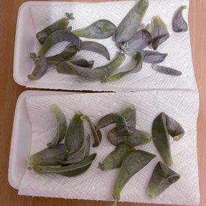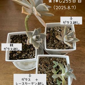 グラパラリーフ。2024年9月に苗を購入。 葉挿し(というより葉置き)してから94日目。 明るいところ(ガラス越し)に置いた子株ちゃんは順調に大きくなっています。 が! 暗いところ(ガラス+厚めレースカーテン越し)に置いた子株ちゃんは、徒長して、根もいまいち張らず、コロンと倒れたと思ったら、根を上にしてU字型になってます(意味分からないと思いますが、4枚目写真見てみてください)。 このU字の底の部分から根が出たりするのか?? とりあえず、暗いところでは生育不良になることは分かったので、このまま、もう一つの子株ちゃんと同じ明るい場所に移しました(正確にはカーテンを動かしただけだけれども)。 親株ちゃんも、葉が落ちた所から脇芽(っていうのか?)が出てきました(2枚目の写真参照)。 この先どんな形になるのだろうか? ————— Graptopetalum paraguayense ベンケイソウ科グラプトペタルム属 常緑多年草、多肉植物 元はメキシコなど中南米原産で観賞用として人気のあるグラプトペタルムという品種をアグリアシストジャパン株式会社(AAJ社)が食用に改良したもの。「はりんご」という名称でも品種登録されている。 (元となったグラプトペタルム・パラグアエンセは、「朧月」という名称でも呼ばれている) ケールと同量のカルシウムやマグネシウムなどがあるとされていて、4枚食べれば牛乳100mlと同じカルシウムを摂ることができる。一枚の葉にビタミン、ミネラル、マグネシウム、カルシウムなどを豊富に含み、「食べるサプリメント」とも呼ばれるほど、栄養価が高い。二日酔い予防効果もある。