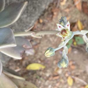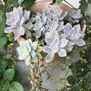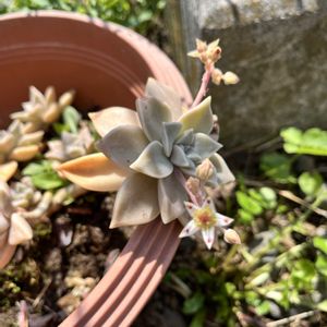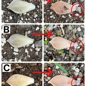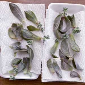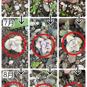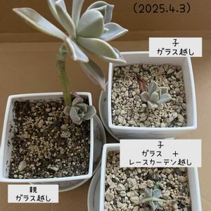 グラパラリーフ。2024年9月に苗を購入。 葉挿し(というより葉置き)してから約半年が過ぎ、子株たちも元気に育っていますが(2枚目画像)、今から約1ヶ月前、屋外でも葉挿ししてみました。 親株からもいだ3枚の葉を、それぞれ条件の違う3箇所に置いてみました。 A. 一番日向、雨には当たり放題。 B. 半日陰、一応軒下で雨は若干当たりにくい C.半日陰、雨には当たり放題 1ヶ月たち、全部に芽が出てきてるー! すごい。雨に当たっても全然大丈夫なんだ😳 このまま夏、冬いけるのか、見守りたいと思います。 ————— Graptopetalum paraguayense ベンケイソウ科グラプトペタルム属 常緑多年草、多肉植物 元はメキシコなど中南米原産で観賞用として人気のあるグラプトペタルムという品種をアグリアシストジャパン株式会社(AAJ社)が食用に改良したもの。「はりんご」という名称でも品種登録されている。 (元となったグラプトペタルム・パラグアエンセは、「朧月」という名称でも呼ばれている) ケールと同量のカルシウムやマグネシウムなどがあるとされていて、4枚食べれば牛乳100mlと同じカルシウムを摂ることができる。一枚の葉にビタミン、ミネラル、マグネシウム、カルシウムなどを豊富に含み、「食べるサプリメント」とも呼ばれるほど、栄養価が高い。二日酔い予防効果もある。