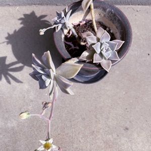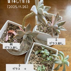 グラパラリーフ。2024年9月に苗を購入。 葉挿し(というより葉置き)してから129日目。 2枚目:親株ちゃん。葉が落ちた所から出てきた脇芽(っていうのか?)、急成長。 で、その脇芽の真ん中あたりから白っぽい半透明の何かが出てきているのだが。 根っこ?? 3枚目:明るい所(ガラス越し)に置いた子株ちゃんは、順調だけどあまり大きさ変わらないなー。 4枚目:暗めの所(ガラス+レースカーテン越し)の徒長してひっくり返った子株ちゃん。 ひっくり返り具合がさらに進んでヨガの違うポーズになった的な。 前回フォロワーさんに根が出てるんじゃ?って指摘された件は、1枚の葉っぱが取れて、それが葉挿し状態になったらしい。孫株が生まれ、葉っぱも出てきました。 さらに太もも(?)の辺りから根っこが出てきてるんですけど。 何がどうなるやら。目が離せません。 ————— Graptopetalum paraguayense ベンケイソウ科グラプトペタルム属 常緑多年草、多肉植物 元はメキシコなど中南米原産で観賞用として人気のあるグラプトペタルムという品種をアグリアシストジャパン株式会社(AAJ社)が食用に改良したもの。「はりんご」という名称でも品種登録されている。 (元となったグラプトペタルム・パラグアエンセは、「朧月」という名称でも呼ばれている) ケールと同量のカルシウムやマグネシウムなどがあるとされていて、4枚食べれば牛乳100mlと同じカルシウムを摂ることができる。一枚の葉にビタミン、ミネラル、マグネシウム、カルシウムなどを豊富に含み、「食べるサプリメント」とも呼ばれるほど、栄養価が高い。二日酔い予防効果もある。