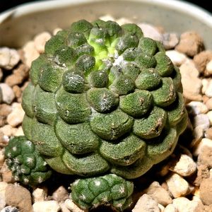 土が乾いてからたっぷりと灌水とか書いているけど、屋外屋根付き、置場所鉢底網目空気ツウツウでもない限り、そんな事したら子株はは腐るし虫がわきます! オマケに縦長に育ったら徒長ですよ ということで、水は月2回位に抑えています 水を控えると、多毛な白い子株が生えてきました 冬場の茶褐色からガラッと変わり、カメレオンのような緑色になりました 成長点の色は薄い黄緑色です