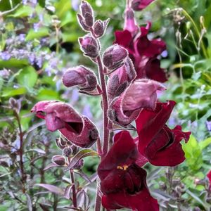 今日のお花 キンギョソウ ブロンズレッド オオバコ科 キンギョソウ属 銅葉色の葉と渋いワインカラーの花が お気に入りです 花後のドクロのような果実が楽しみです🎶 後ろのブルーの花はキャットミントです