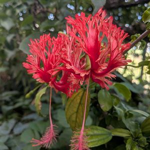 こんばんは 石垣島No.2 です。 2024年10月20日撮影 ①②枚目は、アカバナー 沖縄原種のハイビスカスです。 手のひらサイズの小花ですが、フリンジが、とても艶やかで、真紅の花🌺 蕊も長くて、美しい❣️ 生き生きとしていました。 庭先の地植えでした。 気温は、32℃と、まだまだ夏☀️ この日は、晴れたり、降ったりと、天気がコロコロ変わる1日でした。 湿度が高いので、とても暑く感じます。 ③枚目は、①②と並んで咲いていた、フウリンブッソウゲ 下を向いていると、本当に風鈴に見えます。 切れ込みが見事でした。