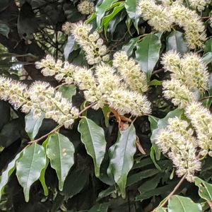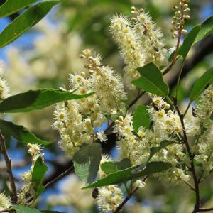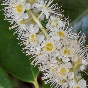 こんばんは🌇 かなりアップが遅れましたが😅、 アケボノソウを見に行った時に見つけた リンボクです。(撮影 10/3) 遠目に見て、あれっ?今頃ウワミズザクラが咲いてるの?って思いましたが、近くで見ると雰囲気が違い、調べるとリンボクでした🌲 長い雄しべがバチバチで可愛いです😍 虫さんにも大人気でした🐝🦋🐝🦋🐝 リンボクはサクラの仲間ですが、 サクラのように落葉樹で春に花を咲かせるのではなく、サクラ属の中では数少ない常緑樹で秋に花を咲かせます🤍 ウワミズザクラに花は似ていますが、ウワミズザクラは葉っぱがサクラの葉のようですが、こちらは葉っぱも全然違い、花も常緑樹というのも、全然サクラっぽくなくてどうして?🤔って思いました。 私の頭ではなかなかついていけません😂 でも、またまたアケボノソウのおまけで、興味深い花に出会えて嬉しかったです😆🎵 リンボク (橉木) バラ科 サクラ属 バクチノキ亜属 (バクチノキ属とする場合もある) 常緑高木または小高木 日本固有種 別名:ヒイラギガシ、カタザクラ 関東・福井県以西〜沖縄の山地の谷間などの照葉樹林内などに生える。湿地を好む。 高さ5~10m。 樹皮は紫色を帯びた黒褐色で桜膚。 葉は互生。狭長楕円形〜狭倒卵形で先端は尾状に尖り、基部は広楔形で、光沢があり、縁は波打つ。若木の葉には針状の鋭い鋸歯があり、老木になると全緑。蜜腺は葉身の基部にあるが、不明瞭。 花期は9~10月。 新枝の葉の脇から長さ5~8㎝の総状花序を出し、白い小さな花を多数つける。 花は直径約5㎜、花弁は円形で5個、縁には歯牙が少しあり、多数の雄しべが突き出る。萼筒は長さ約1.5㎜の杯形。 果実は長さ約1㎝の惰円形の核果で、翌年の5~6月に紫褐色~黒紫色に熟す。 冬芽は円錐形で濃褐色。芽鱗の縁に細かい鋸歯がある。 材は硬質で拍子木や弓などの器具や薪炭に利用。樹皮は染料に、青酸を含む葉と根は薬用になる。