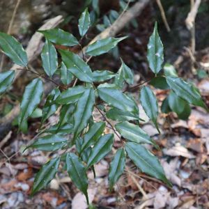 リンボク バラ科バクチノキ属 常緑高木 太平洋側 関東地方以西 日本海側 福井県以西 木肌はサクラ類に似て居ます 花🌼総状花序で白色 晩秋に咲く。解り易くする為、幼木を探した、葉は深緑で縁は波打ち光沢が有り鋭い鋸齒か有る。成長するに従い全縁の葉が多くなる。