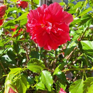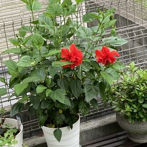 夏に頂いた八重咲きハイビスカス🌺 付いている蕾が全滅状態になったので同じ場所には置けなくなり最終的には我が家にお迎えさせて頂き 植え替えしお日様が当たる場所に置くと復活してかなり大きくなりました。😊 土の表面に白い根っこが😅出始め 再度植え替えをした方がいいような 感じになってほぼ毎日真っ赤な花を咲かせてくれています(∩´∀`∩)💕