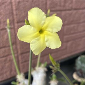 今年はパキポディウム達の開花が盛んで黄色い花が咲き乱れてる状況です。 うちに来て初開花「パキポディウム ブレビカウレ」(下方に少し見切れてる株です)淡い黄色の可愛い花を咲かせてくれました。 ありがとう😊