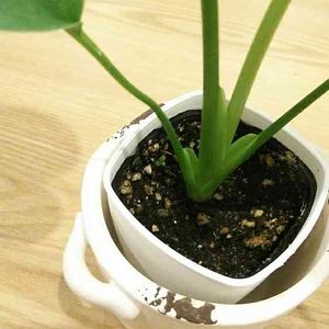さっき気付いた。 モンステラの横から小さな葉っぱが出てるー!! なにこれ? とりあえず、一緒に育ててみる………か?