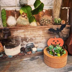 ・ またまたお久しぶりの投稿になりました 🕸🎃ハロウィンリメカン👻🕸 いろんなイメージをスケッチして 作ってみました サボテンも兜やカボチャ風な 子を寄せてみました 蓋にカキカキしたので低めに寄せ植え ピックは王冠でリメイク♫ 楽しい制作でした〜〜👻
