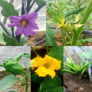 時折雨がふり風があるけど、ハウス内は正午の気温34℃です! 夏野菜達も、調子出てきた! 全部判る方は何人いるかな? 右下↘️は、若い株で少し難しいかも! 正解は、 左上からナス🍆、トマト🍅、ピーマン、カボチャ🎃、ズッキーニでした! 来月くらいから食べるのが楽しみです!