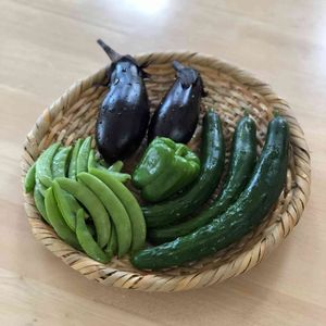 八百屋さんごっこ。 実家で採れた野菜をならべて、 「いらっしゃい!ママ早く買って😤」 画用紙のコインを入れてピーマンを購入。 「本物のおかねじゃないとつかえないの!」 冷蔵庫の野菜…😅 どうやら、ガチャガチャをやるための100円玉を稼ぎたいらしいです💦 昨夜、初めて自分で縫った手ぬぐいがお気に入り。 もう片方はボサボサなので、またそのうち🧵(宮沢賢治アメニモマケズ手ぬぐい😁)