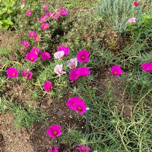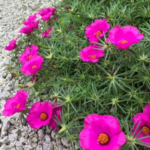 🌺松葉牡丹🌺 花壇の松葉牡丹が防犯砂利の上まで進出してます。朧月まで飲み込まれてます💦 朝開いて次の日にはもう別の花?なんにせよ、盛夏にモリモリ咲いてくれてます。