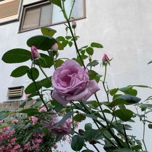 つるブルームーン 三年目 先祖帰りしてしまったのでしょうか😅 ブッシュローズみたい…。 二番花が、蕾も沢山あります✨ もう返り咲き? 四季咲き性、先祖帰り確定??