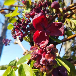 三葉アケビ💠 アケビ科アケビ属 アケビには三葉アケビと五葉アケビがあります 三葉アケビは暗紫色の小さな花がつきます 五葉アケビは薄ピンクの花の中に紫のコントラストがかわいい♪ 両方とも雄花はお花が大きいようですよ 又機会があったら見比べてください🙋