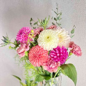 アレンジフラワー ダリア カーネーション エリンジウム ユーカリ