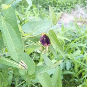 花の後かな、花を見たかったと思いました 帰宅して検索したらウマノスズクサさんのようです 不思議な花です 川沿いの道にて
