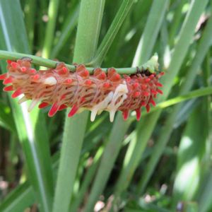 成虫は好きでよく追いかけるが、モスラは今ひとつ好きになれない! 加えて好きなウマノスズクサを食べ尽くすモスラには敵意が湧く。 ジャコウアゲハの幼虫♀かな?