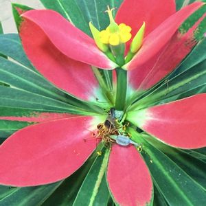 「ジャマイカン・ポインセチア」 原産 カリブ海沿岸 別名 ユーフォルビア・プニケア ※花弁は無く茎の先端に黄色くて丸い密腺と緑色の子房で構成された小花。根元には赤い2枚苞葉が付く 京都府立植物園温室2025/12/7 ポインセチア展開催中