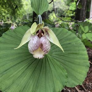 クマガイソウ (熊谷草) 🌱ラン科 アツモリソウ属 ✽高さ30〜40cmの多年草 ✽伸びる地下茎の所々から茎(有毛)と葉を出す ✽葉は茎に向かい合ってつき葉身は径10〜15cmの扇形で、折り畳まれた放射状の襞が目立つ ✽花は1個つき、紫色の筋がある袋状の唇弁が目立つ 名前の由来∶源平時代の武者が矢を防ぐために背につけた母衣(ほろ)に似ていて、源氏の武者「熊谷直実」をイメージしてクマガイソウと名付けられた 群生を見ることが出来ました!✧◝(⁰▿⁰)◜✧