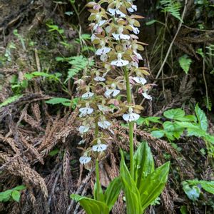コケイラン(小蕙蘭)3 別名 ササエビネ(笹海老根) *ラン科コケイラン属 花期は5〜6月 北海道〜九州のブナ帯林など一定の標高以上の山地の湿り気のある林内に生育する多年草! 花は萼片.即花弁は黄褐色。唇弁は白で紫色の斑点! 葉は20〜30cmの1〜2枚の細長いもので、①④に写る大きな葉はギボウシの葉です❗️ 小さな花の集まりですが1つ1つは個性的で不思議な形が魅力的です❣️ 5月23日撮影